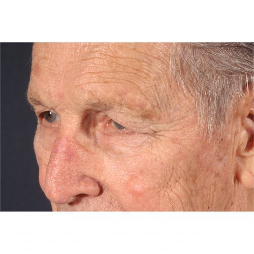 85-year-old sought upper and lower blepharoplasty for visual as well as cosmetic reasons. Here the patient’s eyelids are at the correct level (ie. he does not have ptosis). However, the redundant skin of the upper lids obstructs his field of view (blepharochalasis). Fat has been removed from the lower lids.
