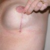 This 37-year-old patient displays extreme ‘ptosis’ (droopiness) of the breasts with asymmetry. Ptosis may occur due to massive weight loss, congenitally stretchy skin or simply old age. It is a common indication for mastopexy (breast lift). When there is preoperative asymmetry the operation has to be modified so the breasts end up looking the same. In this case a small asymmetrical breast reduction was required to balance the breasts.