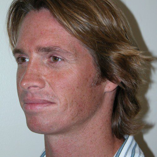 Tip projection remained good, despite the reduction of a large dorsal ‘hump’ in this 33 year old white male. This is unusual: with large hump reductions, the tip generally has to be supported with a cartilage graft. In fact, no work was carried out on the nasal tip, which was already well-defined aesthetically.
